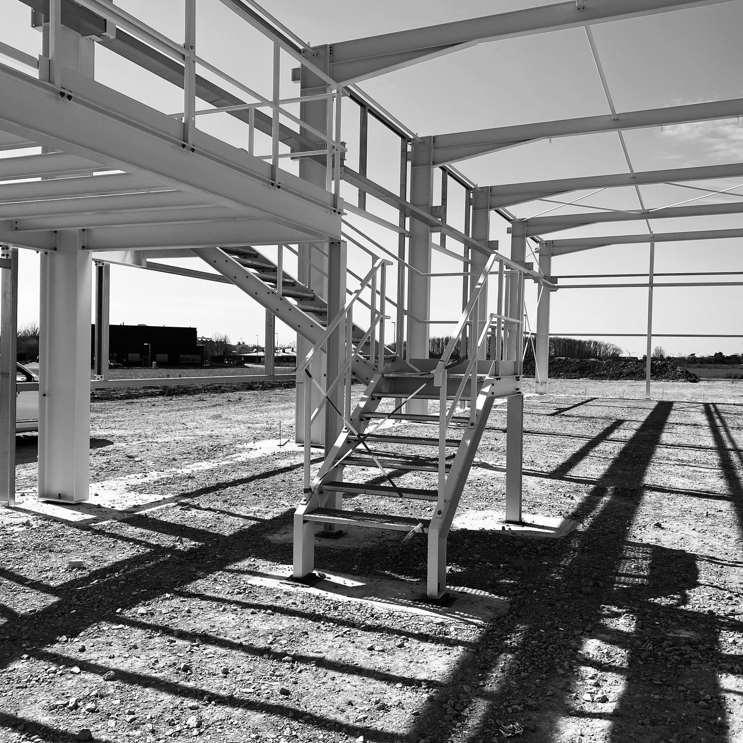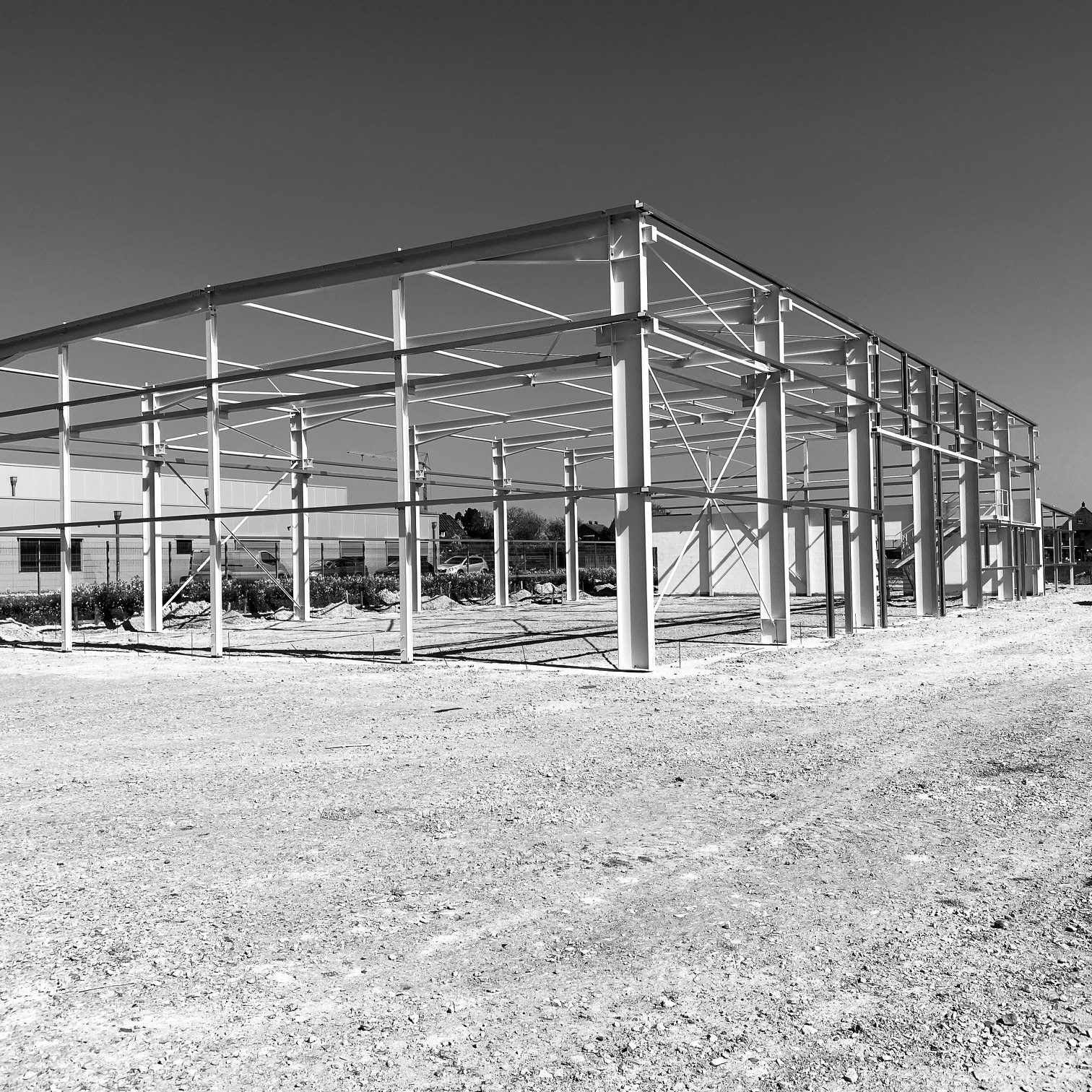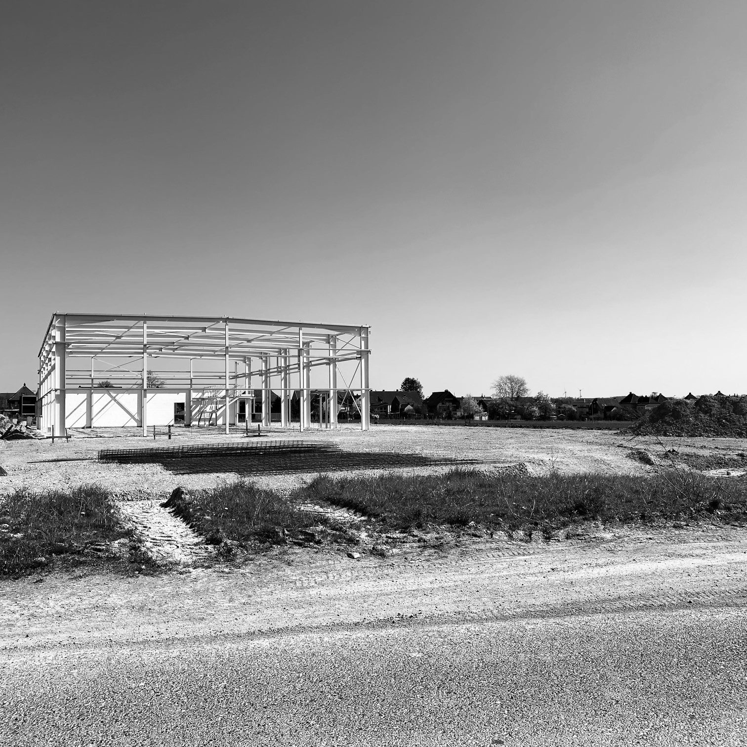 Die Stahlkonstruktion steht nun fertig auf dem Baufeld und wartet auf die Verkleidung.